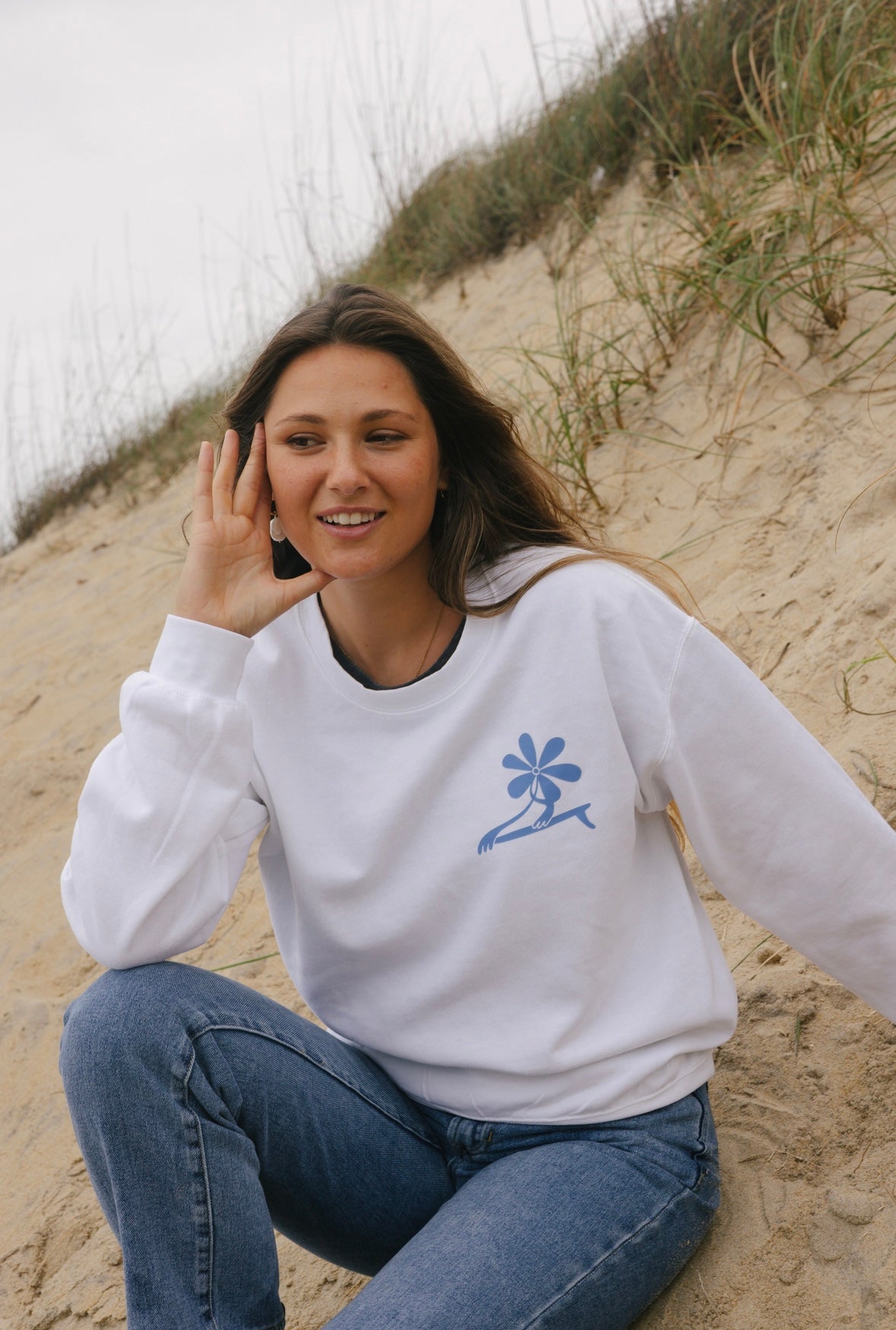 Cotton/polyester white fleece lined crewneck with the checkered funky flora design on back, featuring the funky flora design on front